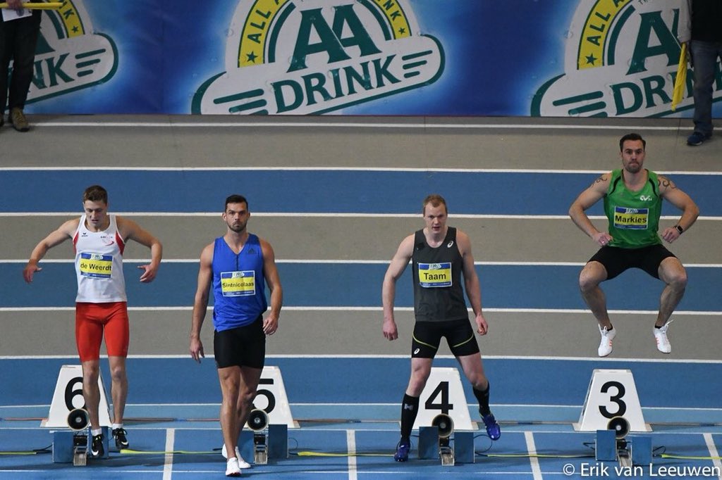 Op de zaterdag, de eerste dag bij de mannen, hadden de mannen vier onderdelen op het programma: 60m, verspringen, kogel en hoogspringen. Nout schoot uit de startblokken en liep een fantastische tijd. In 6.97s (PR) werd hij winnaar voor Eelco (7.02) en Rik Taam (7.02). Rik is lid van het talententeam van de Atletiekunie.